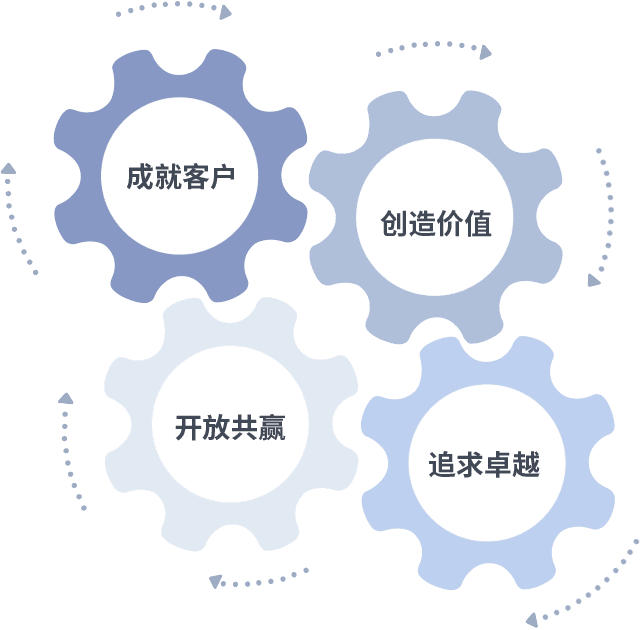 成就客户是一切决策的出发点,,创造价值是衡量所有工作的标准,,追求卓越是我们做事做人的态度,,,开放共赢是我们的格局也是最终的结果。。。价值观的齿轮环环相扣,,,推动着组织里的每个人不断向前。。。。