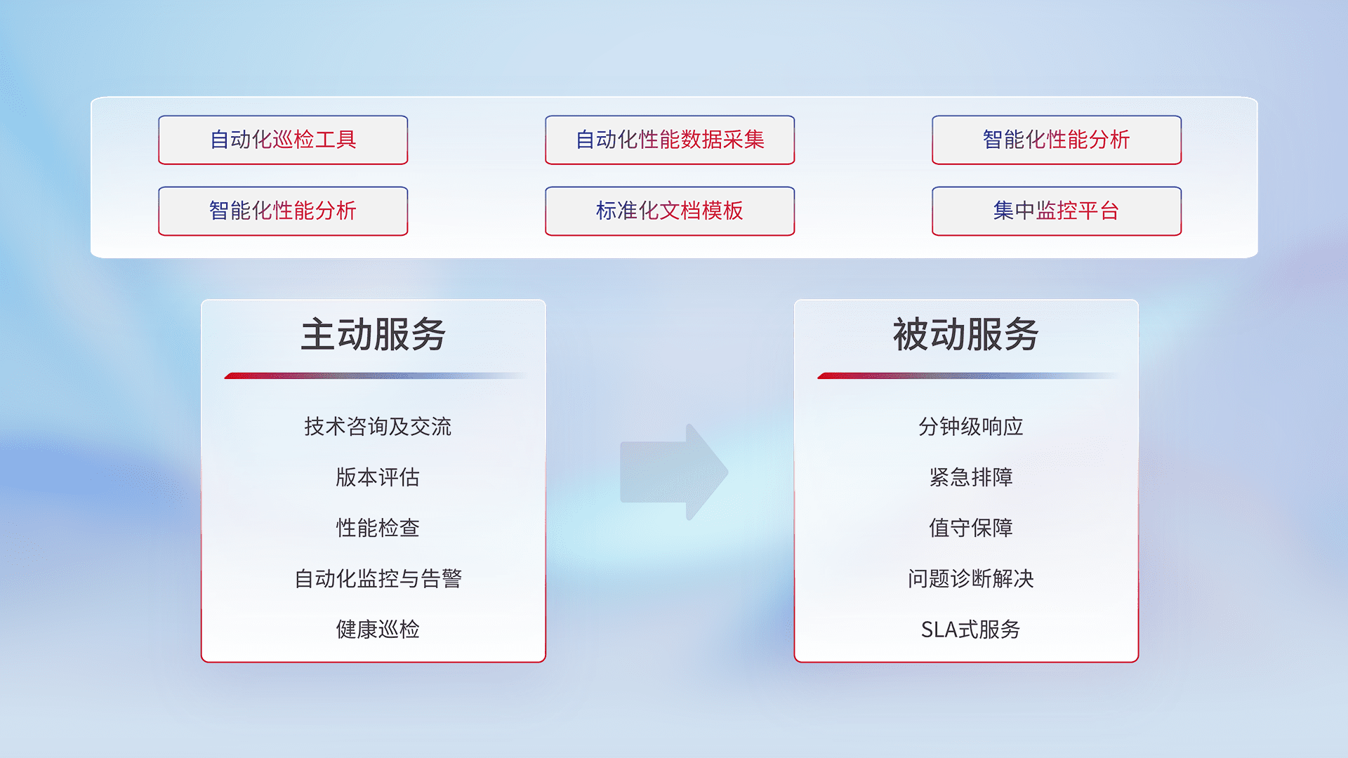 智能化工具和标准化文档,,保障服务质量,,提供主动服务(包含技术咨询、、、、版本评估、、性能检查、、、自动化监控与告警、、健康巡检)和被动服务包含(分钟级响应、、、紧急排障、、值守保障、、、、问题诊断解决、、、SLA服务)。。。